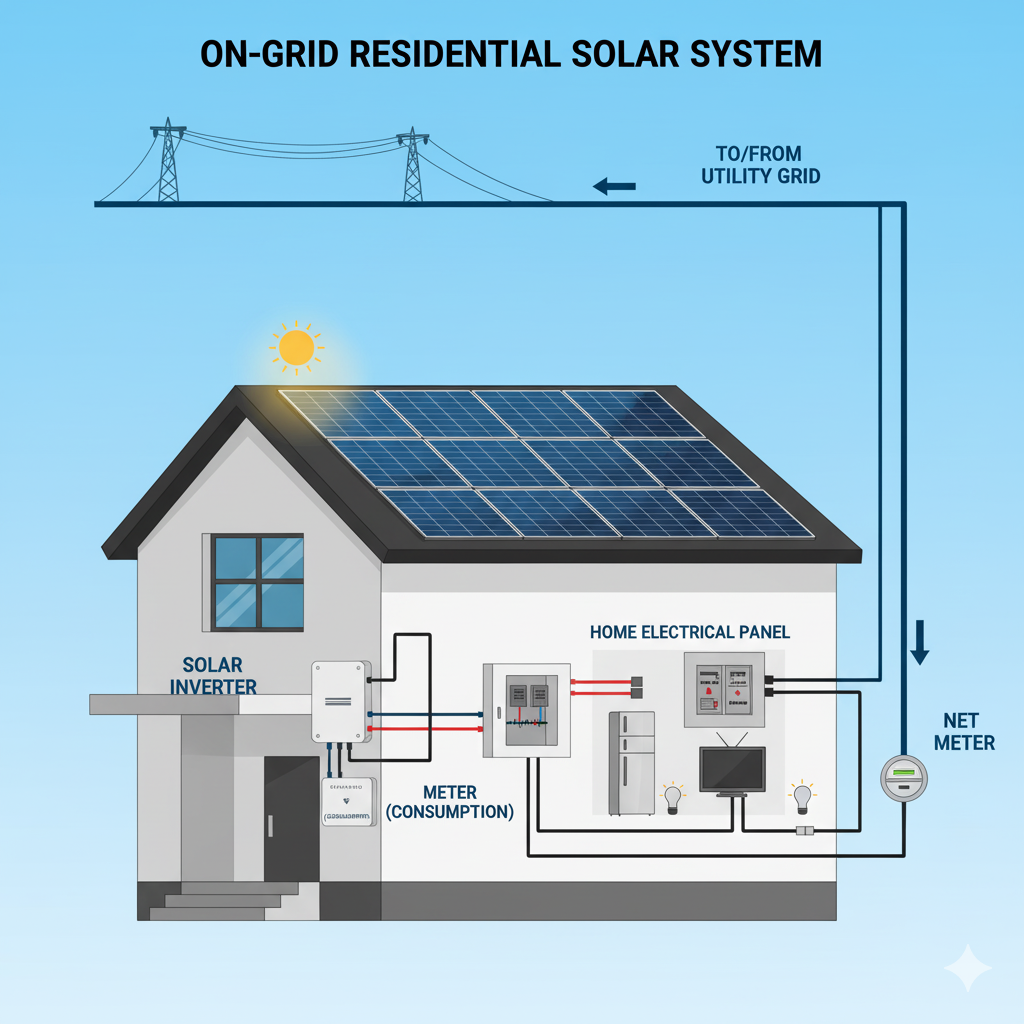 • DC to AC Conversion – The on-grid inverter converts DC to AC for household appliances.
